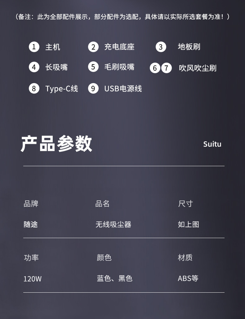 [Product accessories]: straw1pcs, brush 1pcs, manual 1pcs, Type-C charging cable 1pcs (optional), floor brush 1pcs (optional), mouthpiece 1pcs, small brush 1pcs, charging base 1pcs (optional),